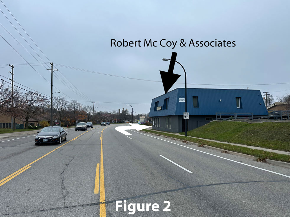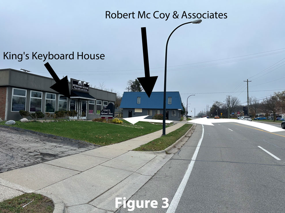 The easiest way to get to the lower parking lot is to come in a driveway between the Robert McCoy and Associates and King's Keyboard House buildings. Figure 1 shows where to access the driveway between the two buildings.